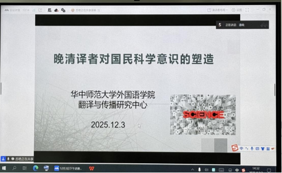 12�3�下午�外国语学�“三江译源讲坛”第九期顺利开展。本期特邀华中师范大学外国语学院翻译与传播研究中心特聘教授苏艳�题为“晚清译者对国民科学意识的塑造”的学术讲座�讲座以线上形式进行,�MTI教育中心副主�张卿�教授主持,吸引了学院80��翻译专业师生参与�本期讲座是落实学院与华中师范大学外国语学院前期达成的对口支援框架协议的举措之一�